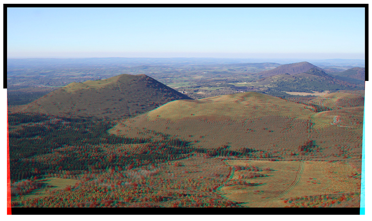 * Depuis le sommet du Puy de Dôme (1465 m), de gauche à droite, le Puy de Côme (1253 m), Vulcania, le Grand Suchet (1231 m) et plus au fond, le Puy de Louchadière (1198 m). Reculez-vous de l'écran pour observer correctement cet anaglyphe (environ à 1 m).