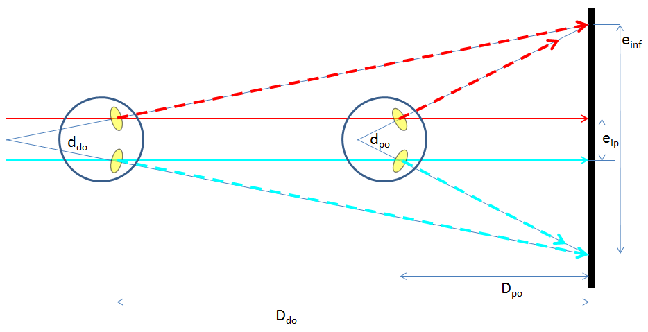 L'illustration ci-dessous schématise la divergence oculaire (dpo , ou ddo) que subissent deux spectateurs lors d'une projection stéréoscopique sur écran (respectivement au premier rang distant de Dpo et au dernier rang distant de Ddo). Ces observateurs ont un même écart inter pupilaire eip. Ils observent un document stéréoscopique dont les points homologues (droit, gauche) pour l'infini (ou objet le plus lointain dans la scène) représentent un écart einf sur l'écran de projection. L'observateur le plus proche subit forcément la divergence la plus grande. Il y a divergence oculaire lorsque l'écart des infinis est plus grande que la disparité binoculaire des observateurs (il serait donc logique de travailler pour la disparité des enfants 45-50 mm). Notre système musculaire osculateur permet une divergence de 1° maximum. Seuls les stéréoscopistes habitués peuvent fusionner le relief avec une telle divergence des yeux. 0,5° est déjà une limite pour la plupart d'entre nous.