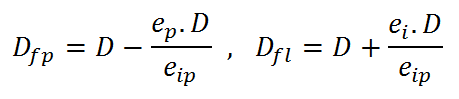 où Df est la distance des yeux de l'observateur où sont fusionés les deux homologues en mm, D la distance des yeux de l'observateur à l'écran de projection en mm, eip est l'écart inter pupilaire (65 mm pour l'adulte, 45 mm pour l'enfant), e est l'écart en mm entre les deux homologues sur l'écran de projection ( valeur e > 0 si l'homologue droit est bien à droite dans ce cas le point sera situé derrière l'écran de projection, e < 0 dans ce cas le point sera situé devant l'écran en jaillissement par l'observateur).