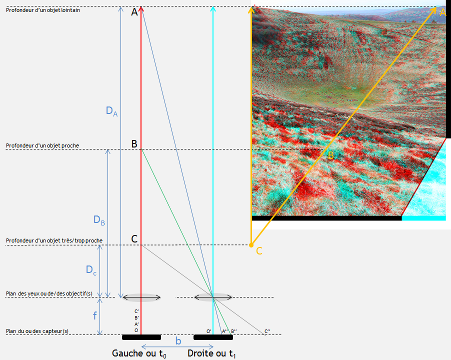 Dans l"illustration ci-dessous, on schématise la géométrie d'une prise de vue stéréoscopique (avec 1 ou 2 appareils, en même temps ou en deux temps) impliquant des objets (A, B, C). Ces objets sont plus ou moins distant des optiques du photographe (aux distances DA, DB, DC), et du capteur lumineux (ou la rétine d'un observateur). On se place dans une situation simple et pédagogique où les objets A, B, C sont parfaitement alignés :