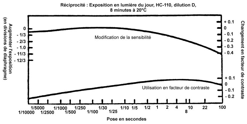 Modifications de la sensibilite et du contraste dus aux effets de réciprocité. Données ayant pour base un développement de 8 minutes à 20°C avec agitation toutes les 30 secondes dans le révélateur KODAK HC-110 (dilution D).