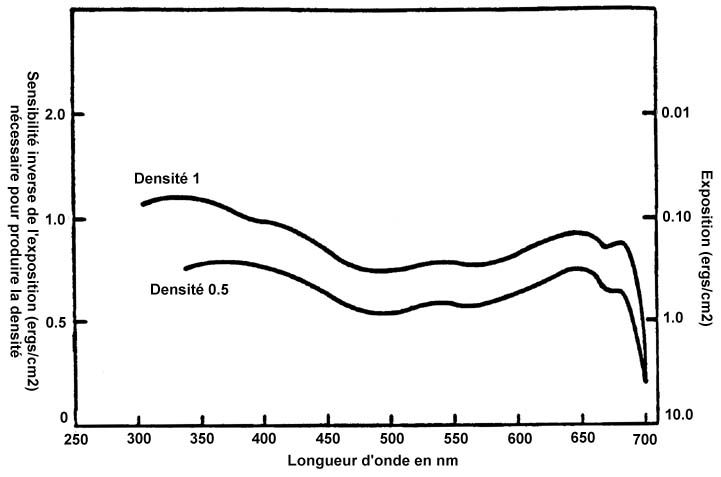 Tout a été mis en oeuvre pour donner au film KODAK Technical Pan 2415 une sensibilité relativement uniforme à toutes les longueurs d'ondes visibles jusqu'à 690 nm. Pour parfaire cette uniformité, certains utilisateurs pourront préférer faire leurs prises de vue à travers un filtre compensateur de couleur qui atténue sélectivement les radiations rouges et bleu-violet comme le filtre KODAK CC 40C ou CC 50C (cyan). L'effet d'un tel filtre est de donner une réponse relativement uniforme jusqu'à 655 nm. Il est à noter que les films panchromatiques normaux ne donnent une telle réponse que jusqu'à 625 nm. Même avec un filtre CC 50C, le Film Technical Pan 2415 enregistre beaucoup mieux les plages rouges des sujets que les surfaces sensibles comme le Film KODAK PANATOMIC-X ou le Film KODAK PLUS-X Pan.